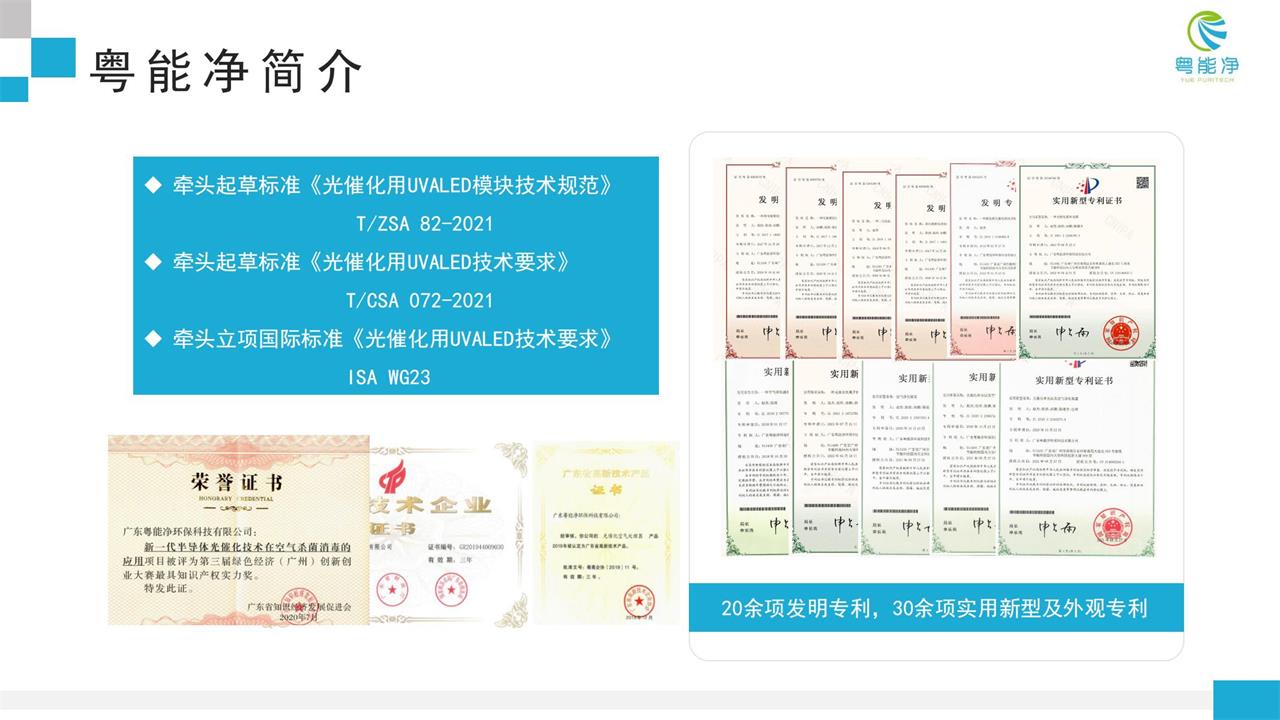 中科粵能凈完全自主知識產(chǎn)權(quán)的新材料用于空氣和水凈化,我司開發(fā)的新型半導體催化劑和基于第三代半導體的UVA-LED光源構(gòu)成的催化氧化單元,能在常溫常壓下高效分解幾乎全部的有機物、礦化硫化物、氮氧化物、去除異味、殺菌消毒,催化氧化單元物理化學性質(zhì)穩(wěn)定,耐腐蝕,綠色環(huán)保,材料可回收,溫度濕度影響小,是新一代半導體催化氧化技術(shù)。