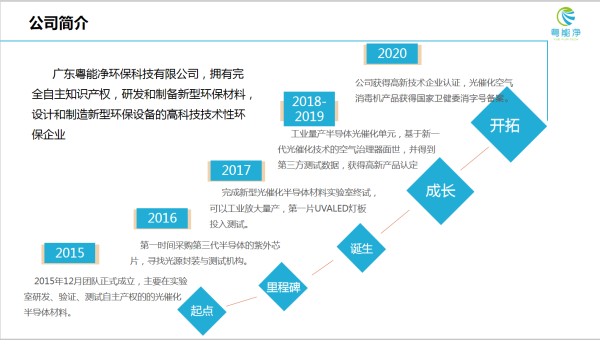 公司擁有完全自主知識產權,研發(fā)和制備新型環(huán)保材料,設計和制造新型環(huán)保設備的高科技技術性環(huán)保企業(yè)。并被第三代半導體聯(lián)盟推薦牽頭起草《光催化凈化UVA LED技術要求》行業(yè)標準。