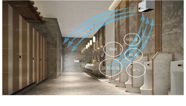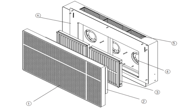 ①進(jìn)風(fēng)口 ②粉塵過濾網(wǎng) ③光催化單元 ④離心風(fēng)機(jī) ⑤出風(fēng)口 ⑥控制面板