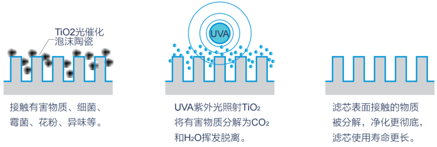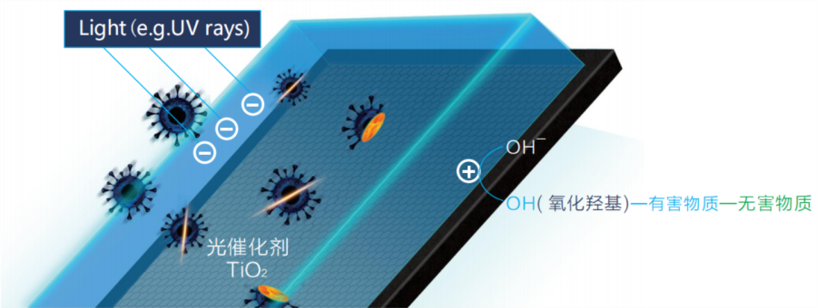 TiO2催化劑在UVA照射下,形成具有強氧化性的電子空穴同時可以與水分子作用形成強氧化性的羥基自由基形成氧化羥基、超氧離子,可以氧化幾乎所有的有機化合物分解成二氧化碳和水,礦化含氮、硫的氣態(tài)化合物,消除異味,同時具備自潔凈功能。