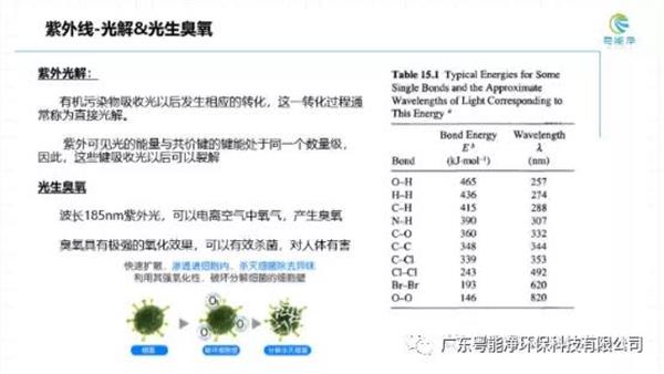 紫外線這部分,其實有紫外光解和紫外光光生臭氧兩個反應。因為紫外線的波長越短,頻率越高,光波本身帶來的能量會越大,這個能量一旦大過有機物或化合物或者細胞本身的細胞鍵之間的能量,就會產生一定的光解效果。