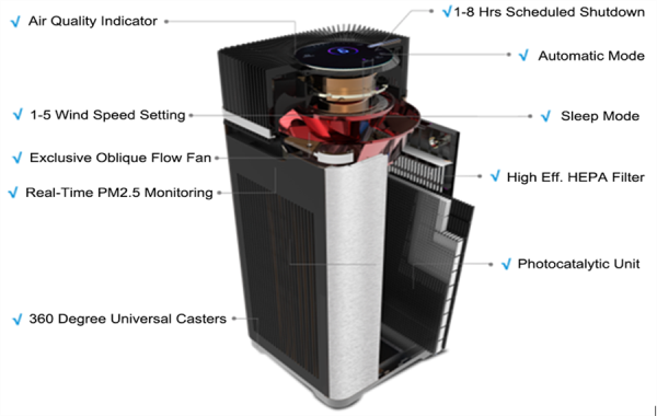 Within 1 hour in the national standard warehouse, the efficiency of virus killing (H3N2) is 97.31%, the efficiency of formaldehyde removal is 93.5%, the efficiency of sterilization is 99.9%, and the efficiency of toluene/xylene/ammonia removal is 92%. The killing rate of human coronavirus was 99.99%, dust mite allergen was removed 98.44%, CADR value was 532m3/h, antibacterial rate of Klebsiella pneumoniae was 99.93%, antibacterial rate of Aspergillus Niger was 99.94%, antibacterial rate of Pseudomonas aeruginosa was 99.92%.